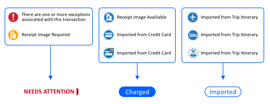 Icons - the icons are a visual device used to inform me about missing information and provide additional information about the expense.